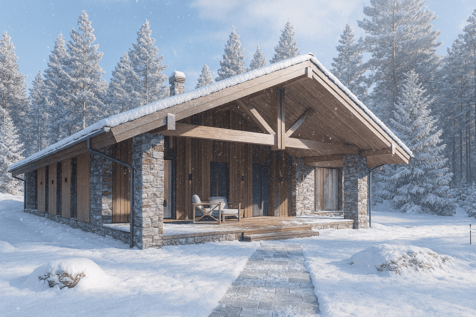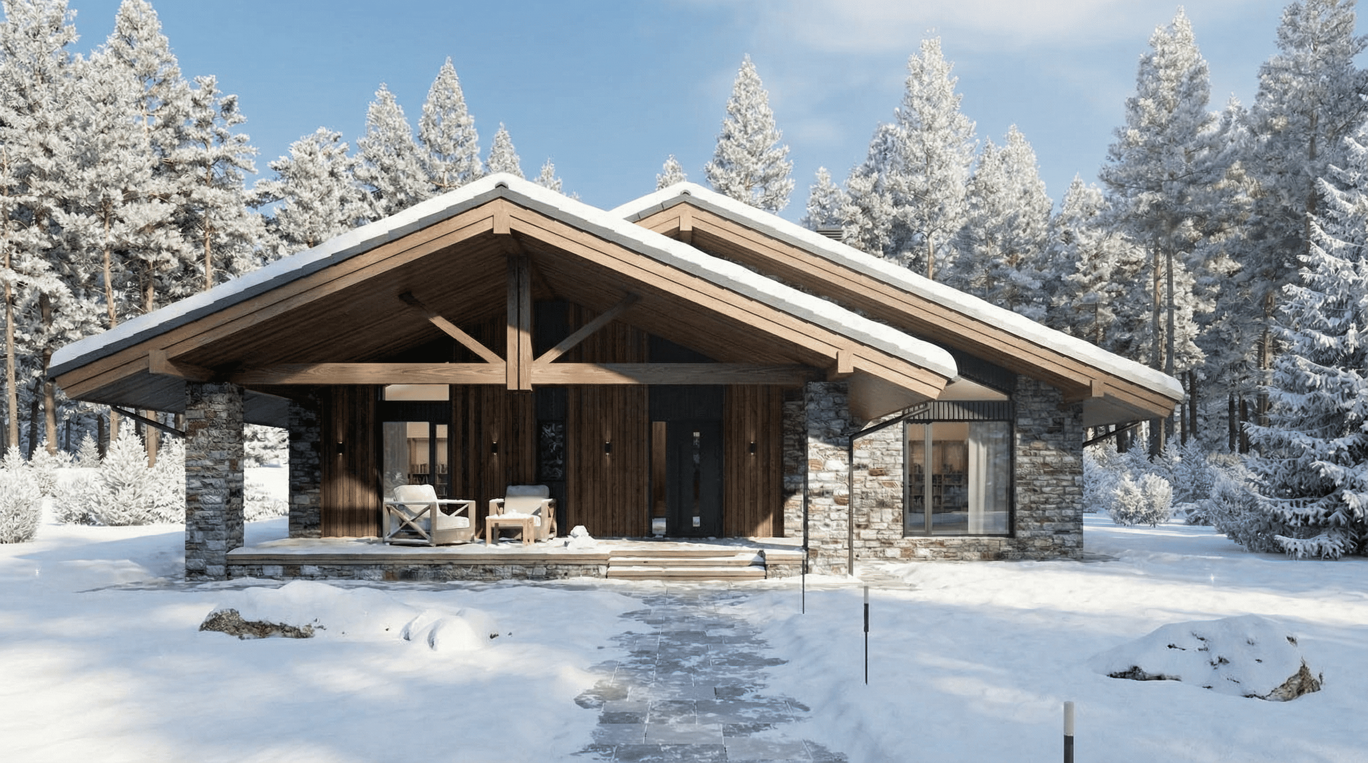 Уютное шале подходит для тихих уединенных участков, органично вписываясь в лесной массив с использованием природных материалов на фасадной отделке. Планировка дома рассчитана для комфортного проживания большой семьи.