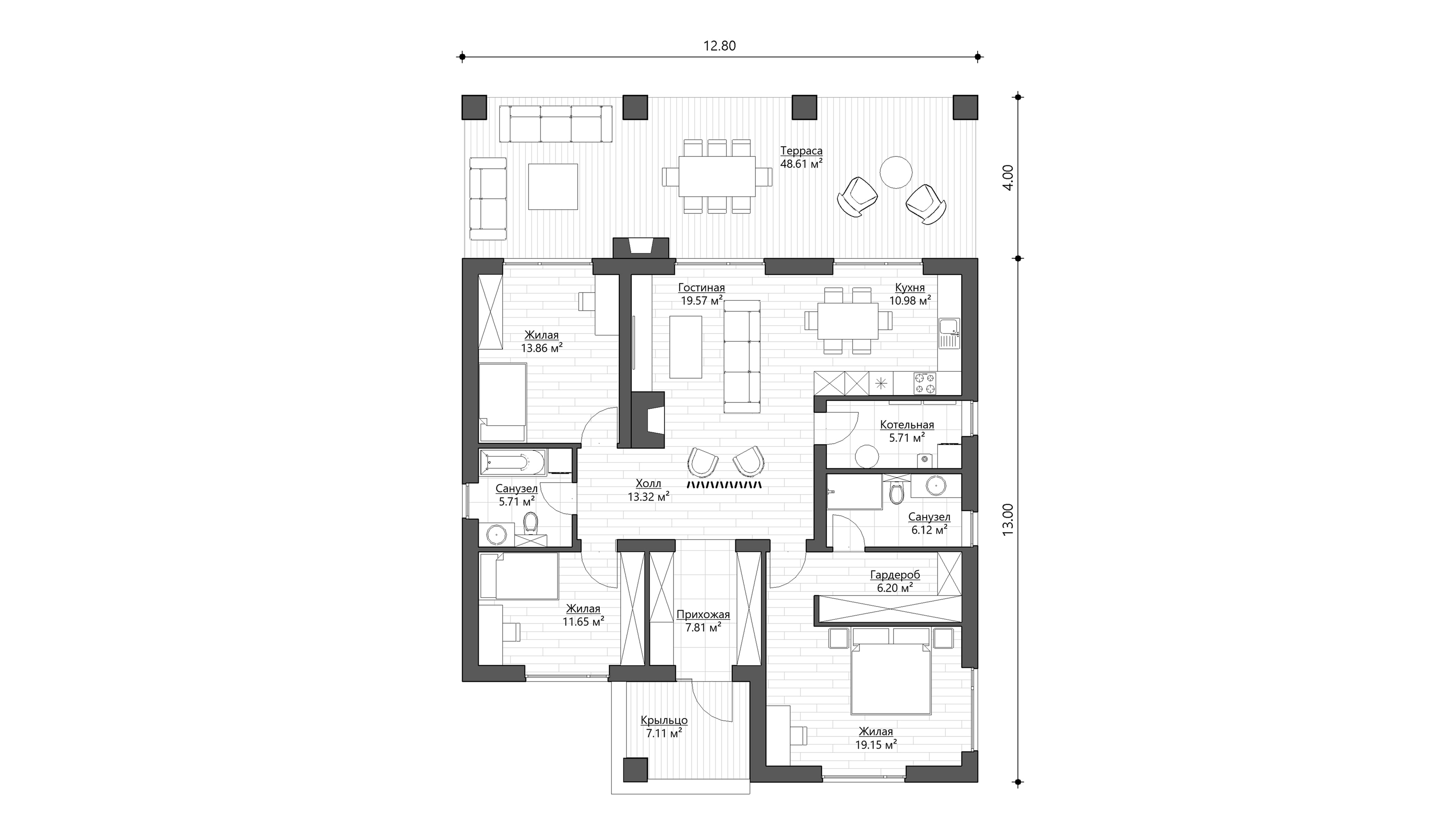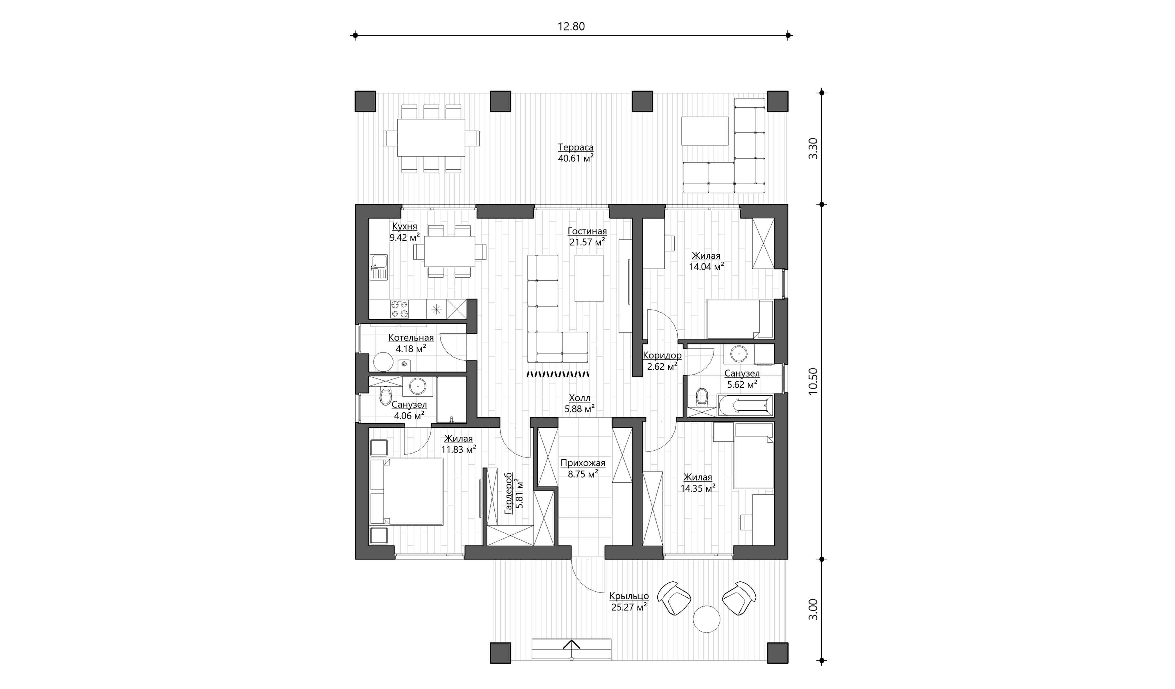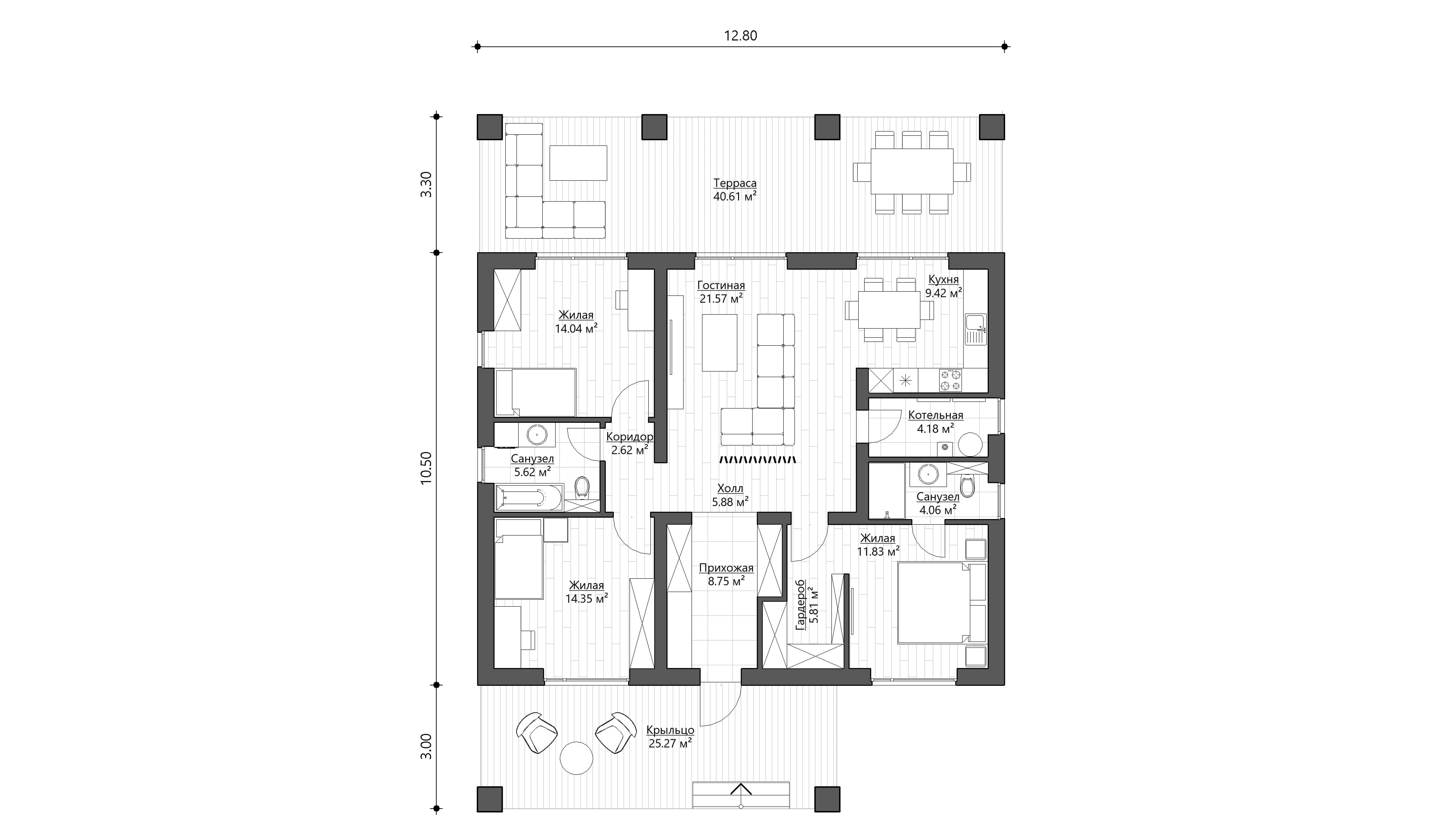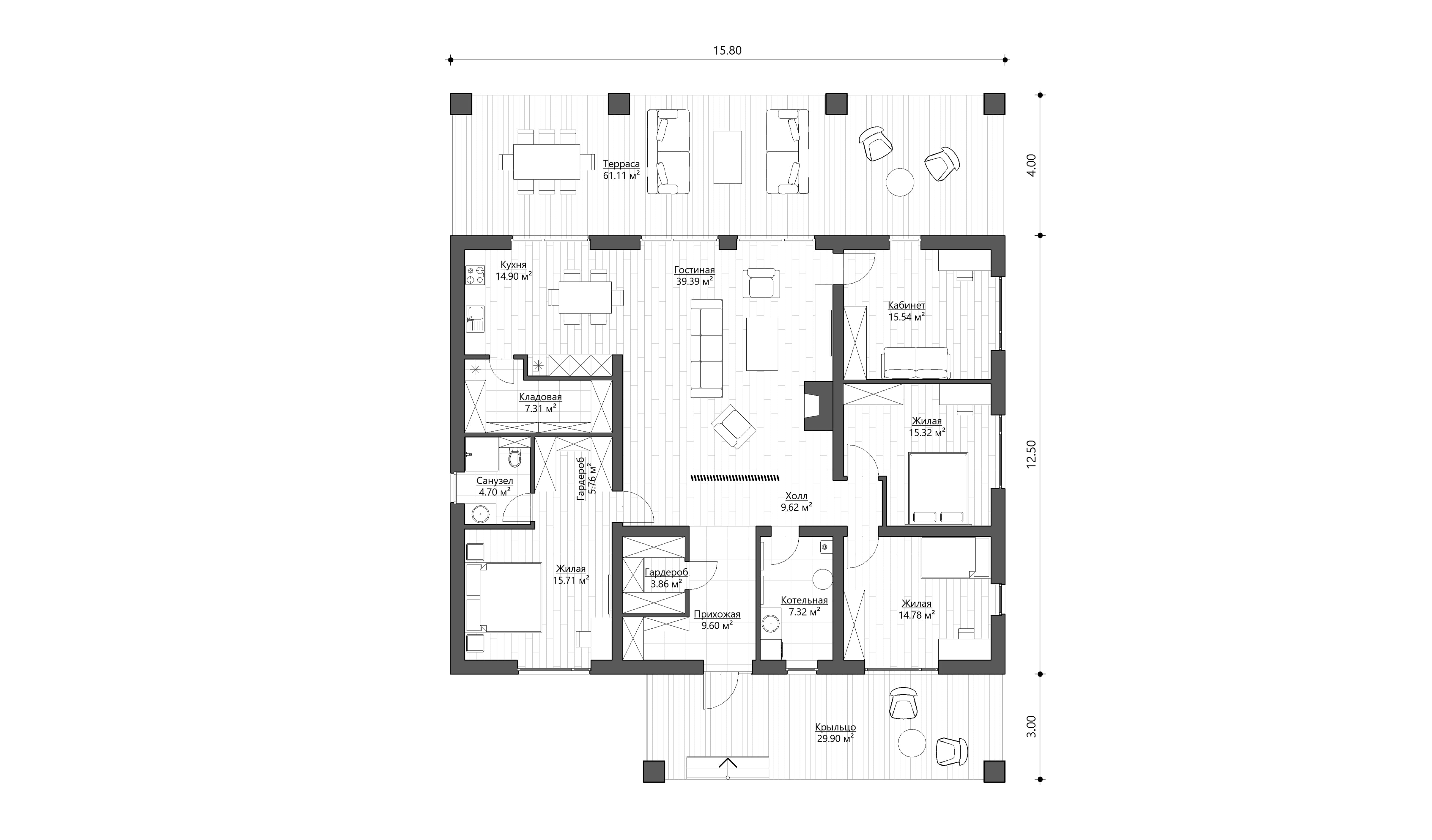 Из особенностей: 2 просторные террасы, гостиная совмещённая в единое пространство с кухней и столовой, 3 спальни и 2 санузла. Чердака в доме нет, потолки повторяют скаты кровли. Такое решение делает помещения более объемными и просторными. Вся инженерная часть сосредоточена в помещении топочной. Проект имеет зеркальный вариант планировки что позволяет разместить его на участке с любой ориентацией по сторонам света.
