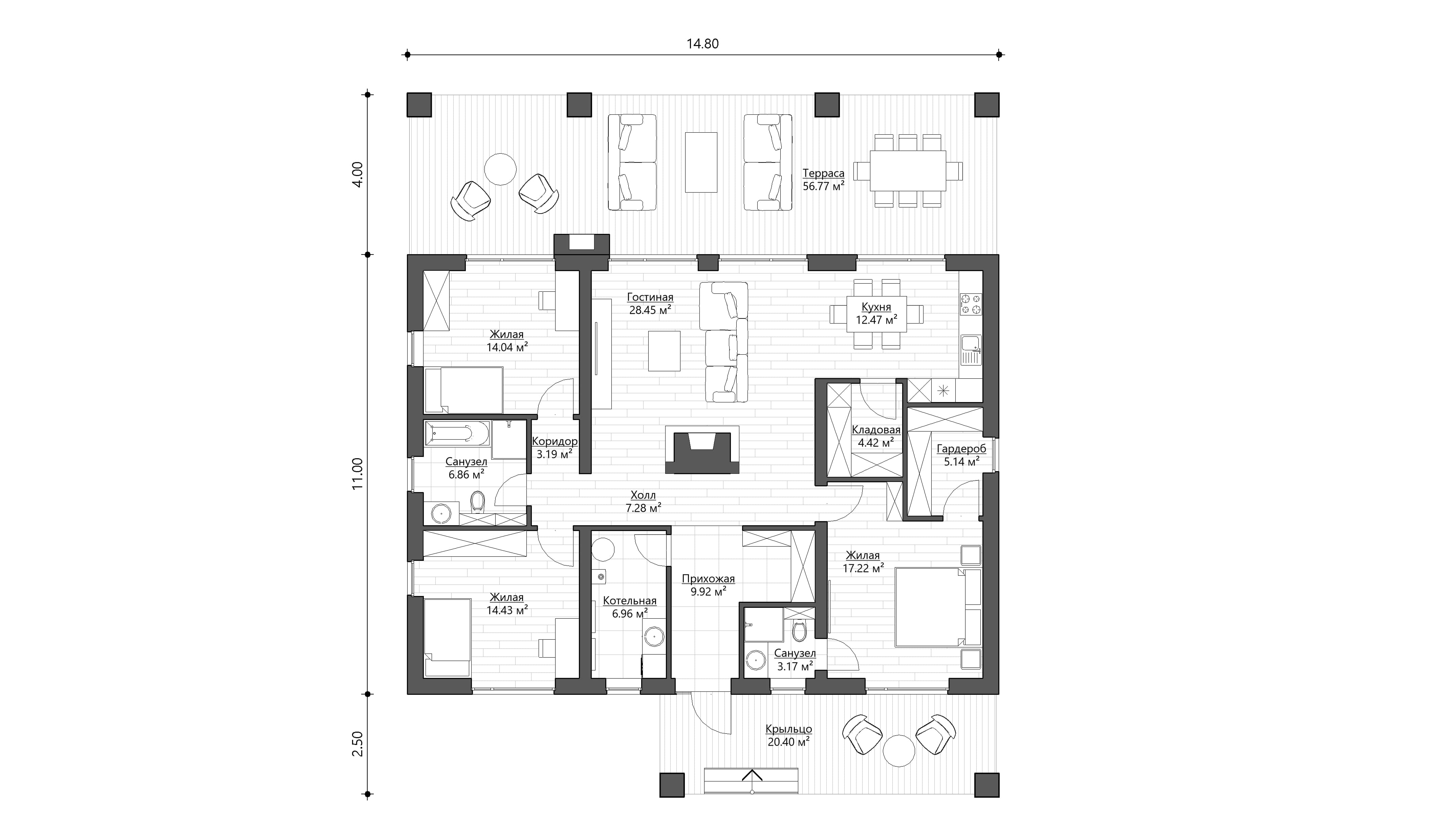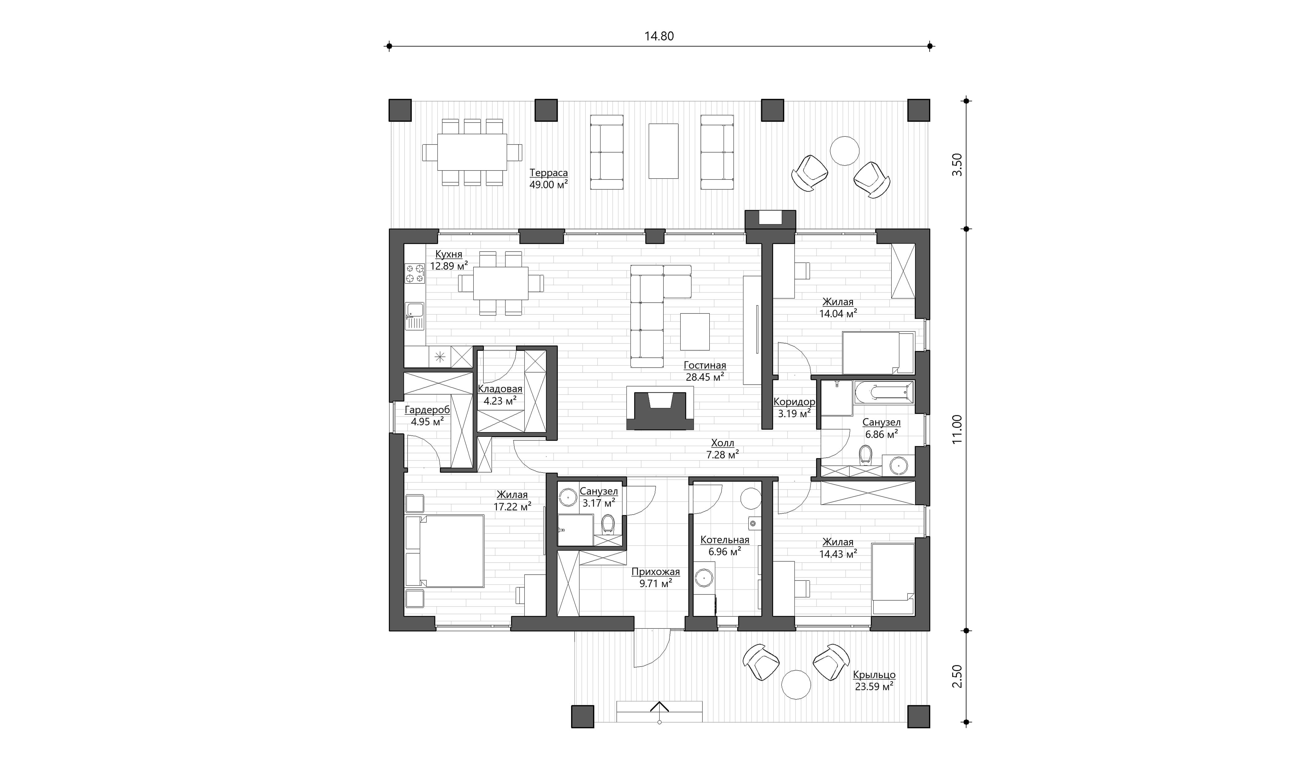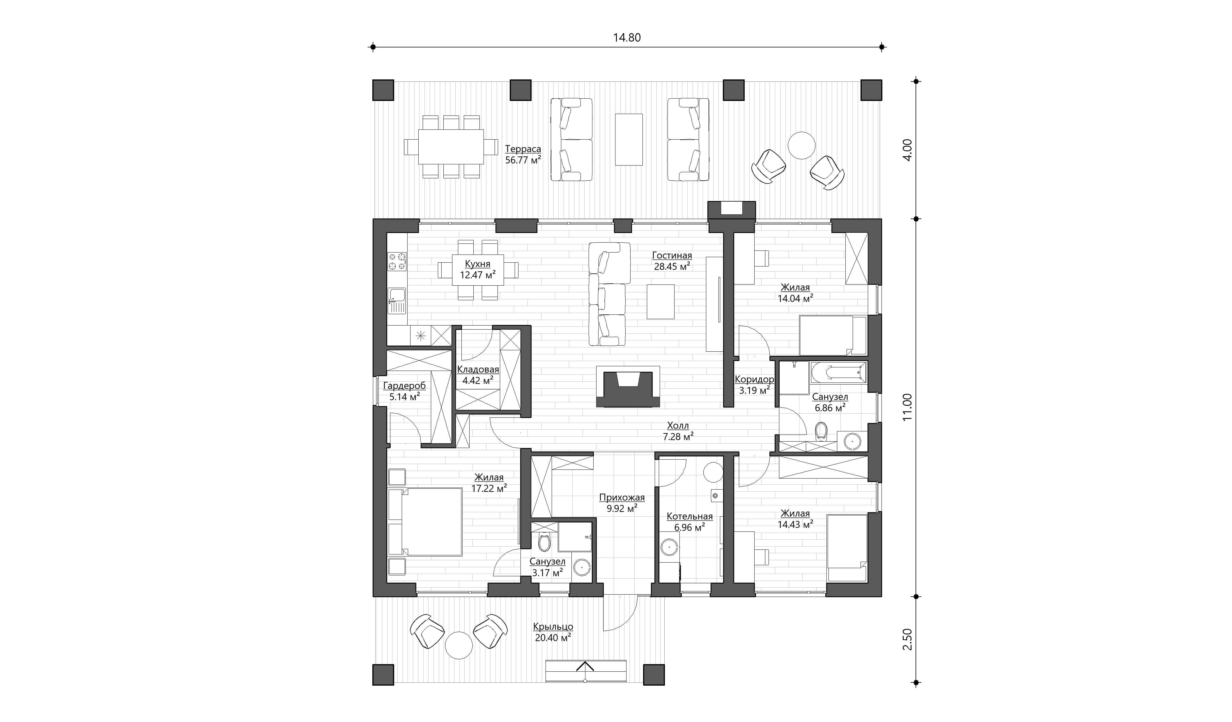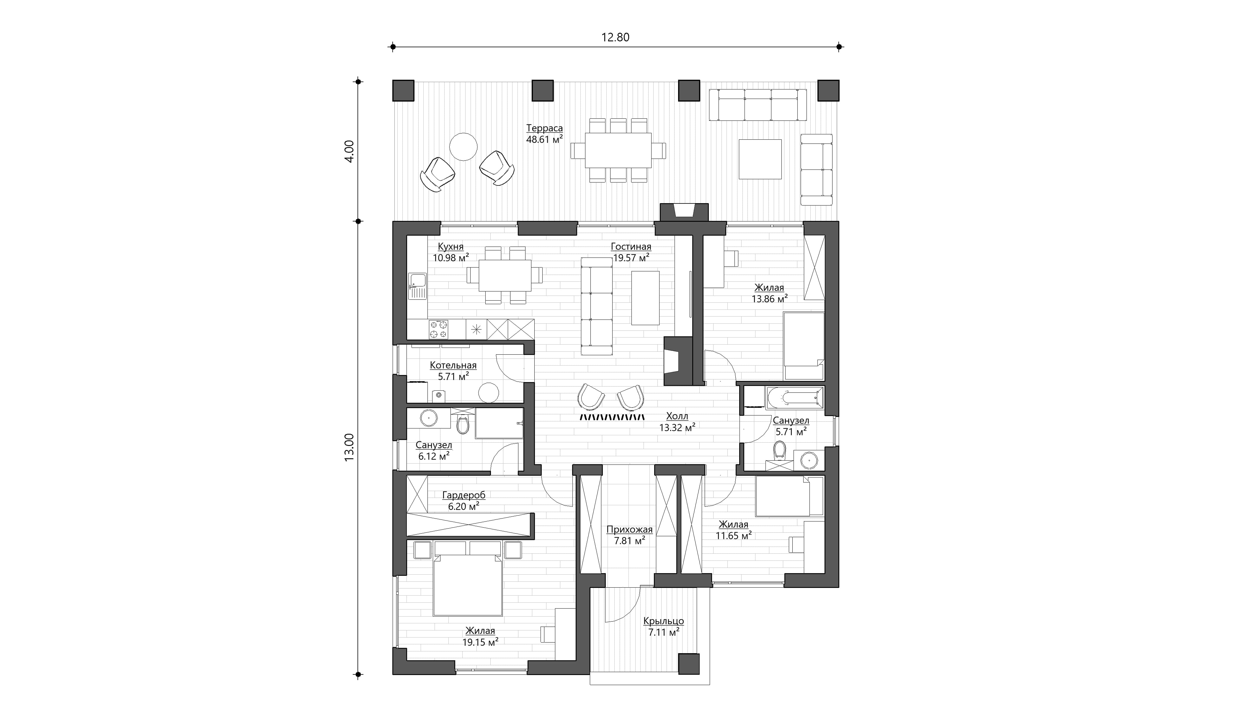 Из особенностей: 2 просторные террасы, гостиная совмещённая в единое пространство с кухней и столовой, 3 спальни и 2 санузла. Чердака в доме нет, потолки повторяют скаты кровли. Такое решение делает помещения более объемными и просторными. Вся инженерная часть сосредоточена в помещении топочной. Проект имеет зеркальный вариант планировки что позволяет разместить его на участке с любой ориентацией по сторонам света.