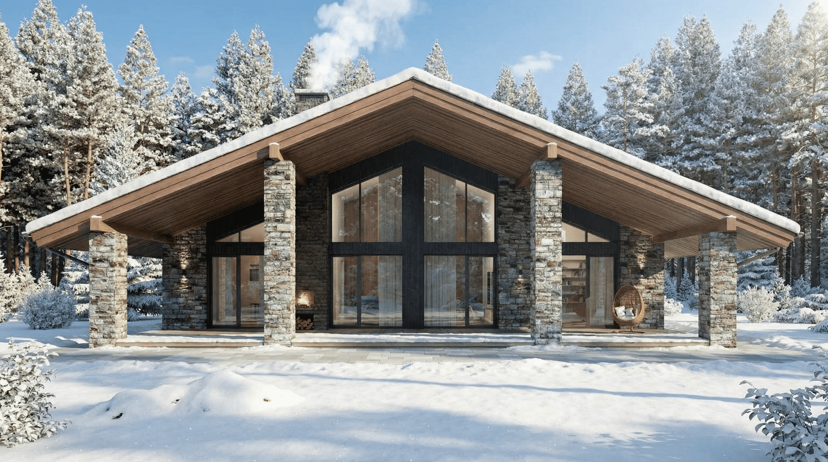Уютное шале подходит для тихих уединенных участков, органично вписываясь в лесной массив с использованием природных материалов на фасадной отделке. Планировка дома рассчитана для комфортного проживания большой семьи.