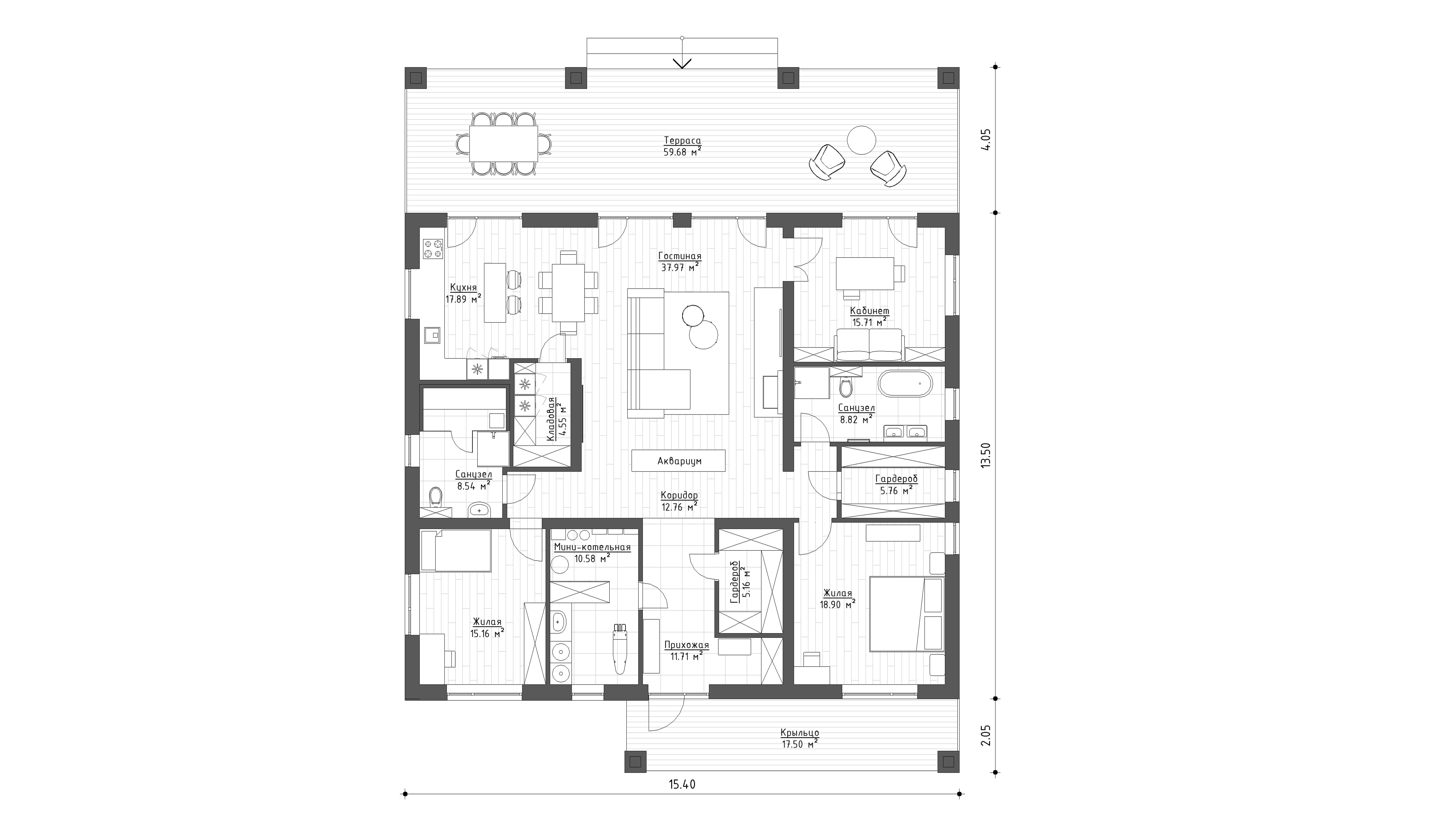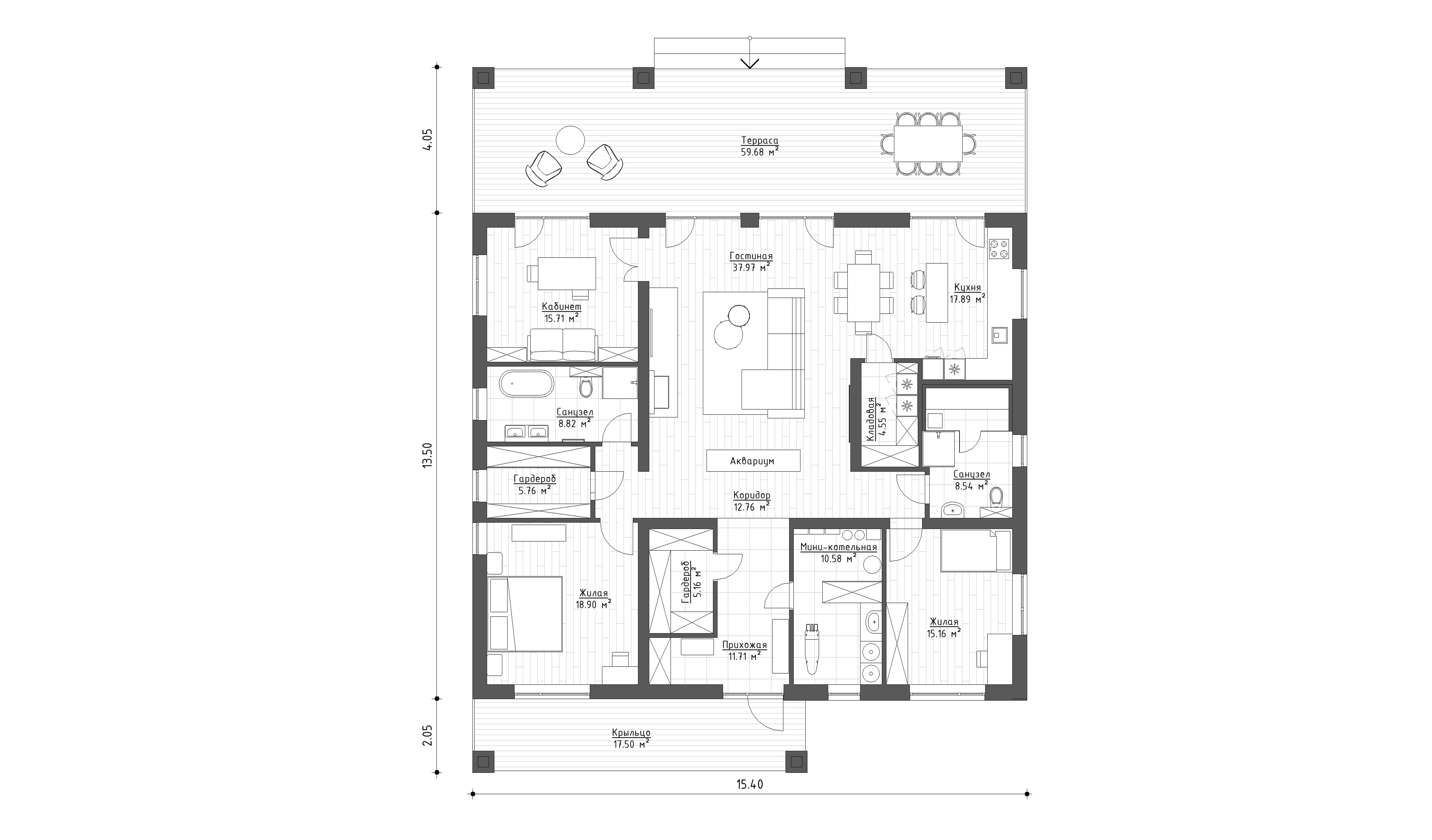 Из особенностей: 2 просторные террасы, гостиная совмещённая в единое пространство с кухней и столовой, 3 спальни и 2 санузла. Чердака в доме нет, потолки повторяют скаты кровли. Такое решение делает помещения более объемными и просторными. Вся инженерная часть сосредоточена в помещении топочной. Проект имеет зеркальный вариант планировки что позволяет разместить его на участке с любой ориентацией по сторонам света.