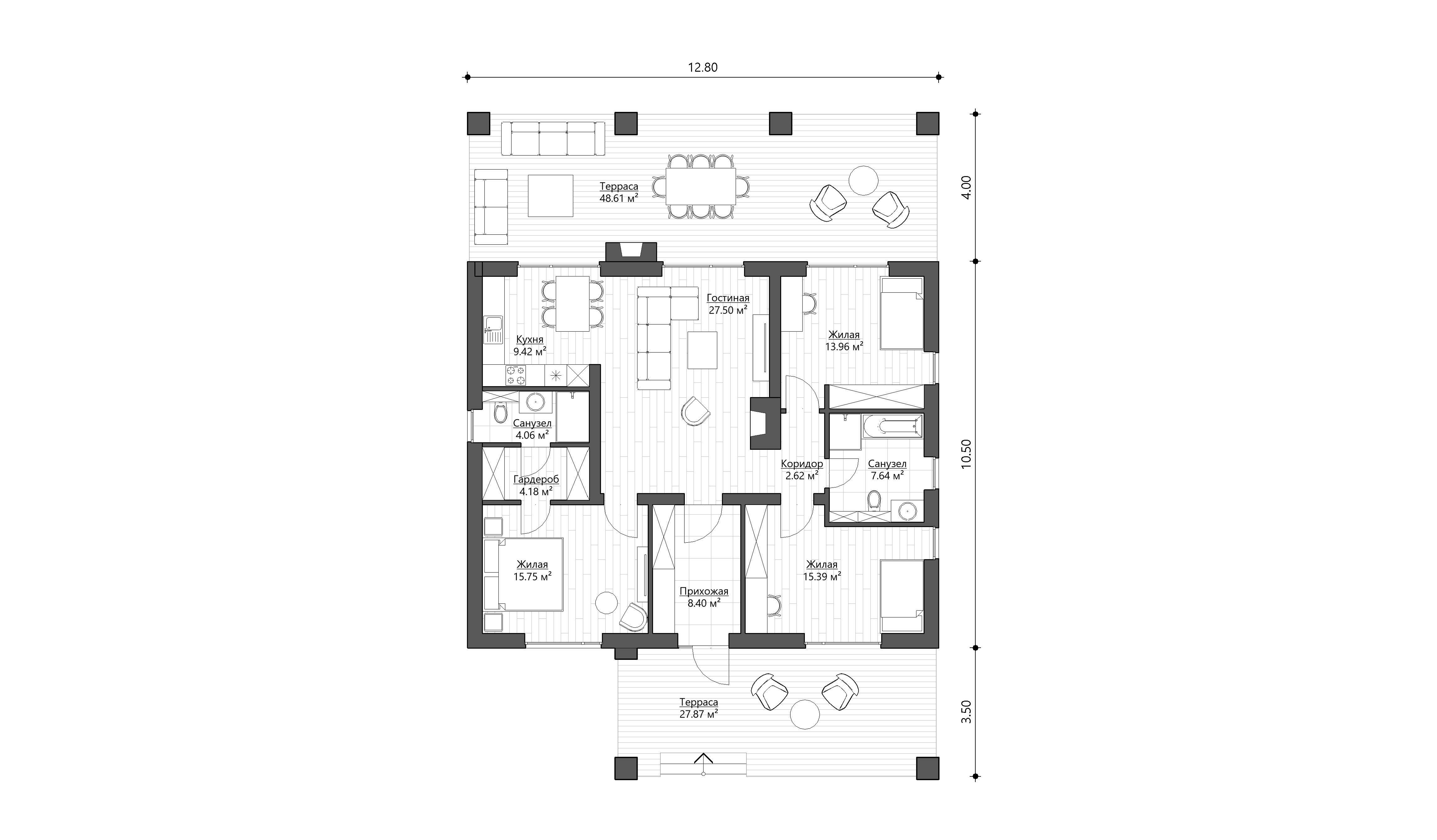 Из особенностей: 2 просторные террасы, гостиная совмещённая в единое пространство с кухней и столовой, 3 спальни и 2 санузла. Чердака в доме нет, потолки повторяют скаты кровли. Такое решение делает помещения более объемными и просторными. Вся инженерная часть сосредоточена в помещении топочной. Проект имеет зеркальный вариант планировки что позволяет разместить его на участке с любой ориентацией по сторонам света.