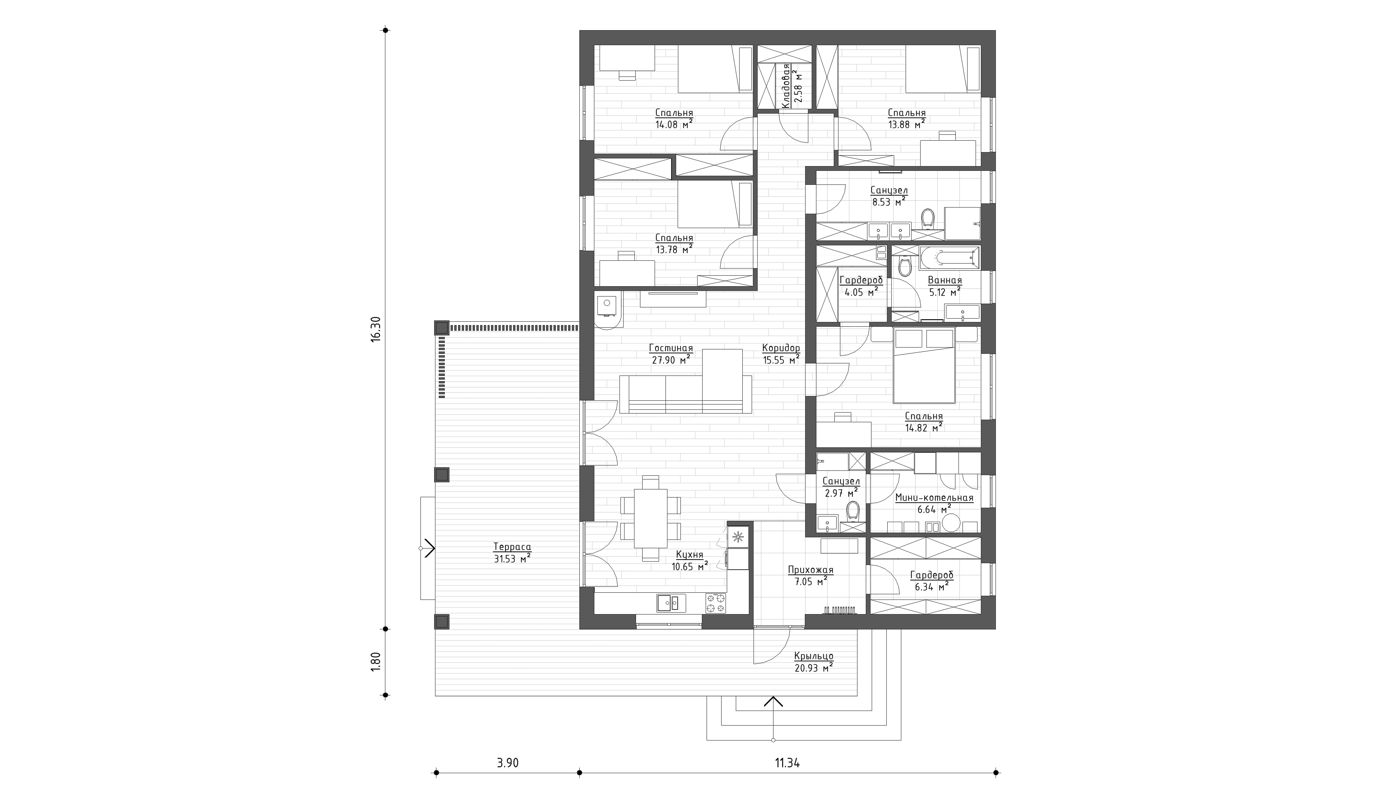 Дом утеплён, оштукатурены стены. Разведена черновая электрика, отопление, водоснабжение, канализация.