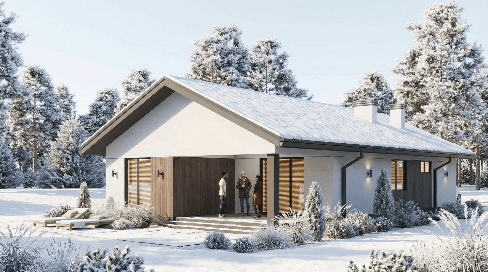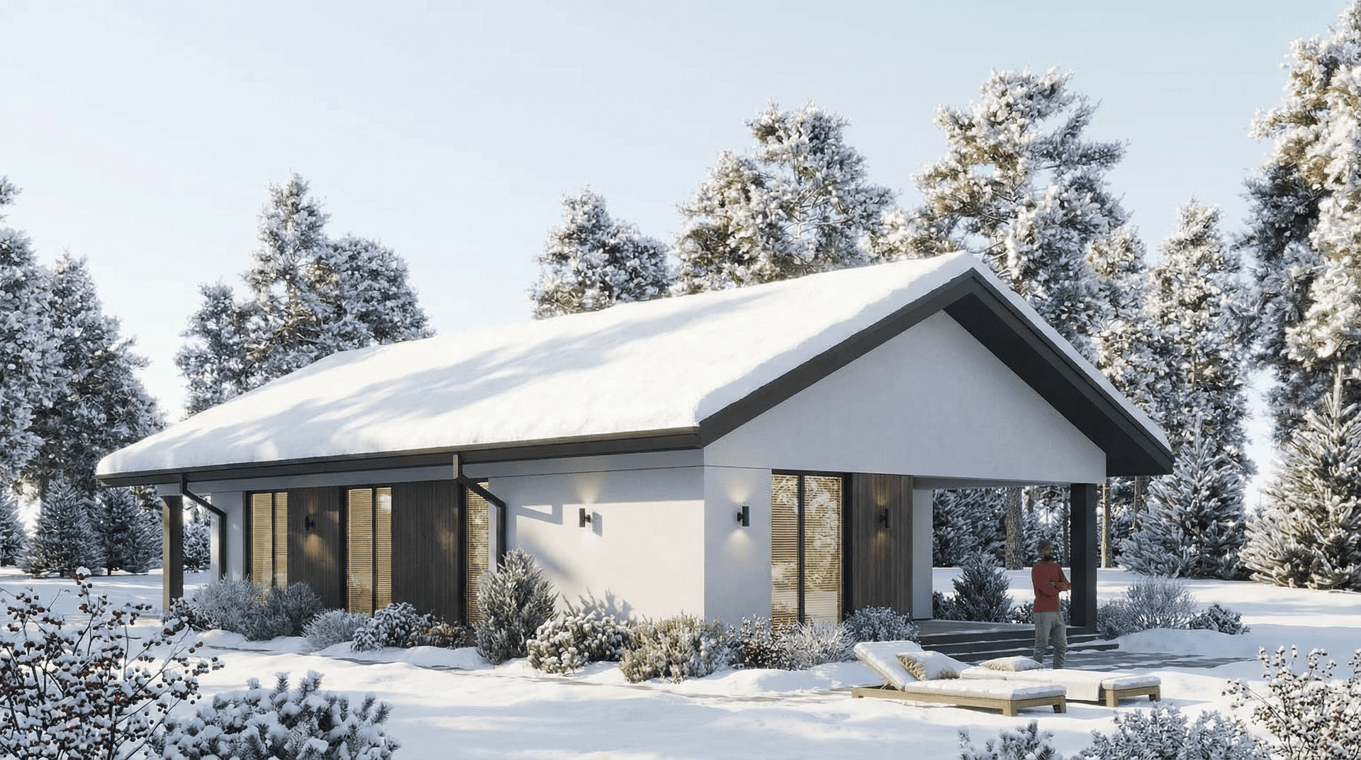 Уютный одноэтажный дом с классической и в тоже время простой двускатной кровлей. Имеет четкое и продуманное зонирование на общую (гостевую) и хозяйскую (спальную) зоны. Отлично подойдет для комфортного проживания и отдыха семьи из 3-5 человек.