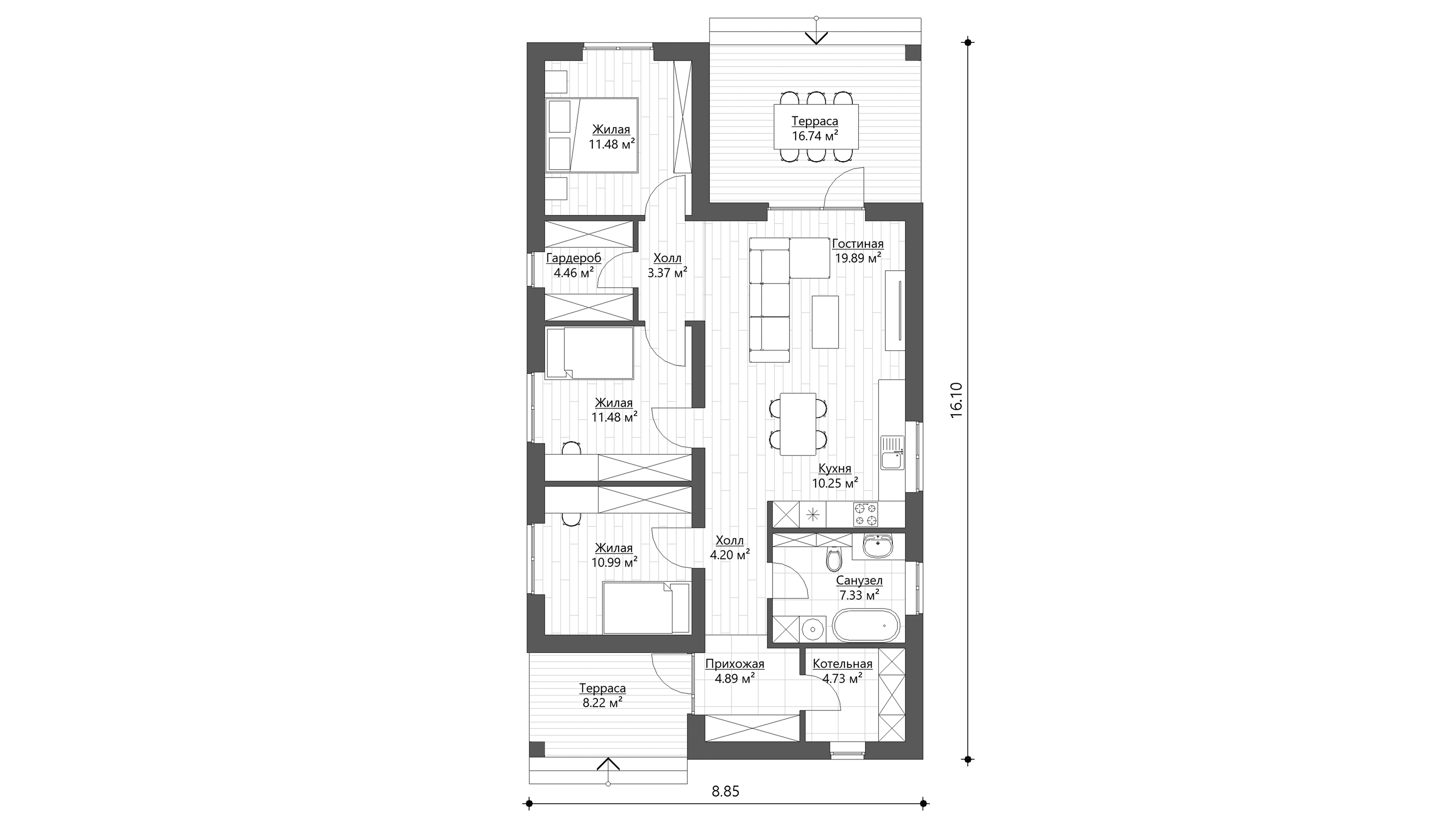 Данная серия проектов предполагает 8 планировочных решений от 63 до 134 м2 внутренней (отапливаемой) площади. Кухня-гостиная объединены в одно общее пространство, откуда можно выйти на просторную террасу.