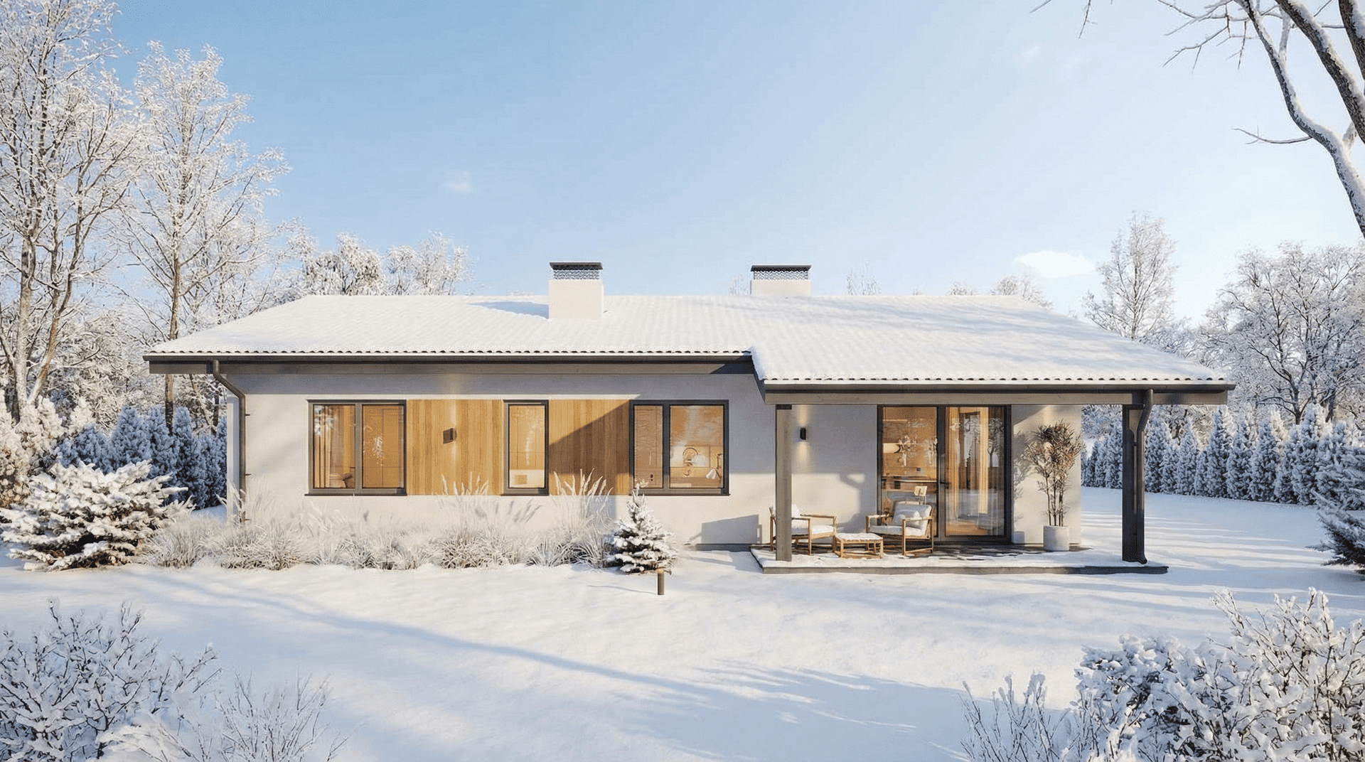 Дом разделен на две функциональные зоны: с левой стороны от входа находится просторная кухня-гостиная с выходом на террасу, справа - спальни, в которых предусмотрены места для работы и учебы, а также встроенные шкафы для хранения вещей.