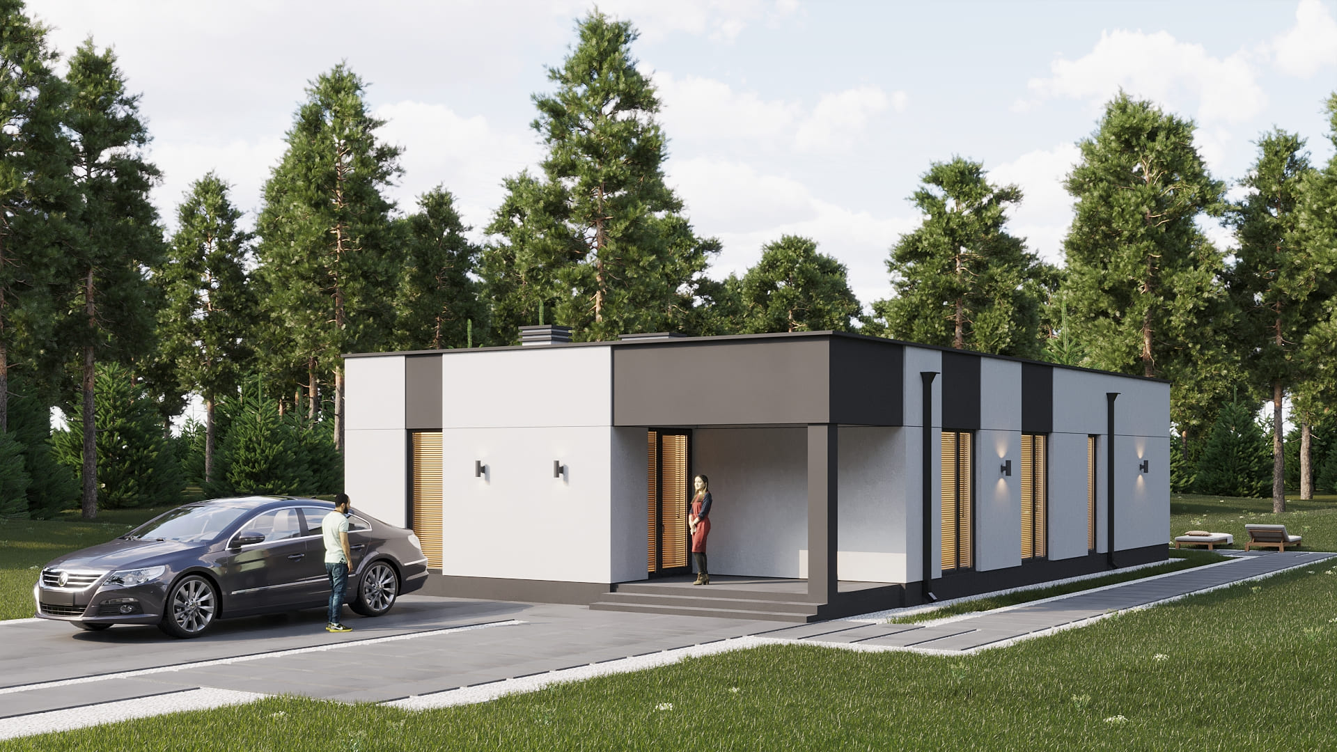 Уютный одноэтажный дом с плоской кровлей. Имеет четкое и продуманное зонирование на общую (гостевую) и хозяйскую (спальную) зоны. Отлично подойдет для комфортного проживания и отдыха семьи из 3-5 человек.
