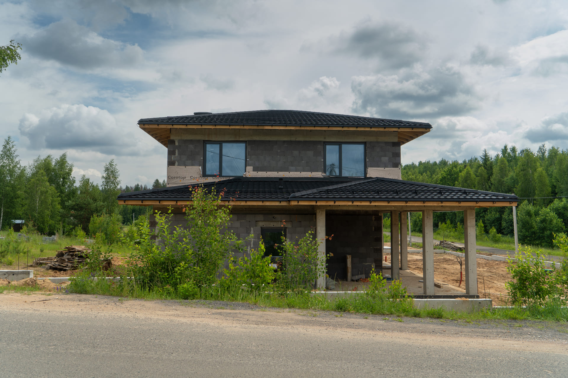 Стропильная система из сухой строганной доски 45х195мм. Кровля - Мягкая черепица по стропильной системе. Так же пирог кровли включает в себя гидроизоляцию из диффузионной мембраны Delta Neo Vent, утепление плитным базальтовым утеплителем Paroc eXtra 250 мм. и пароизоляцию Delta c проклейкой швов специальным скотчем.